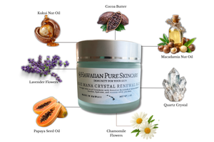 Indulge your skin in the luxurious nourishment of our crystal-infused facial balm, handcrafted with a potent blend of organic Hawaiian oils, plant butters, and tropical botanicals. This rich yet fast-absorbing balm melts into the skin, delivering long-lasting hydration while calming inflammation and promoting radiant renewal.