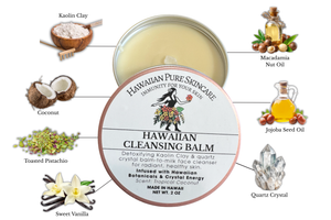 Hawaiian Cleansing Balm transforms your skincare routine into a sacred ritual of renewal. This luxurious balm melts into the skin to effortlessly dissolve makeup, sunscreen, and impurities—while deeply nourishing with Hawaiian-grown botanicals and crystal-infused energy.